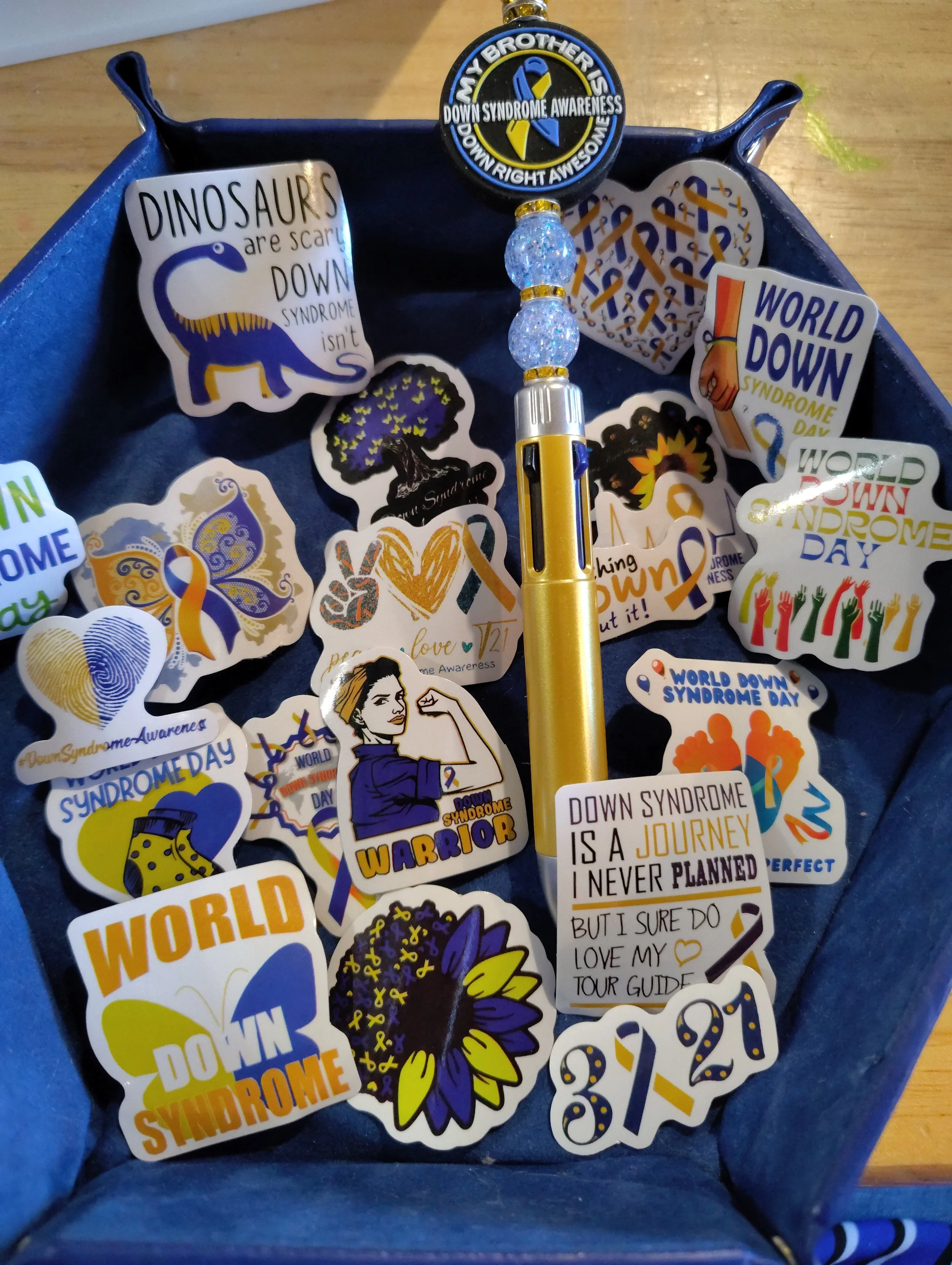 Down Syndrome Categories: All Causes Autism Breast Cancer Awareness Cancer Conditions Alzheimer's and Dementia Ankylosing Spondylosis Cerebral Palsy Chiari Malformation Crohn's Disease Deaf/Hard of Hearing Diabetes Down Syndrome Ehlers-Danlos Syndrome Endometrioses Epilepsy HiV/AIDs Lupus Meniere's Disease Multiple Sclerosis P.O.T.S. Zebras Other Earth Day Fidget Clickers Mental Health ADHD Anxiety OCD PTSD Suicide Prevention Therapy Other Pregnancy and Infant Loss Other Adoption Donate Missing Children Stop Bullying Stop Domestic Violence Sticker Packs Art From The Heart Just for Fandom Fun Bracelet Ornaments Keychains All / Causes / Conditions / Down Syndrome Downs Syndrome Awareness Pen $6.00 Down Syndrome Awareness Trio $12.00